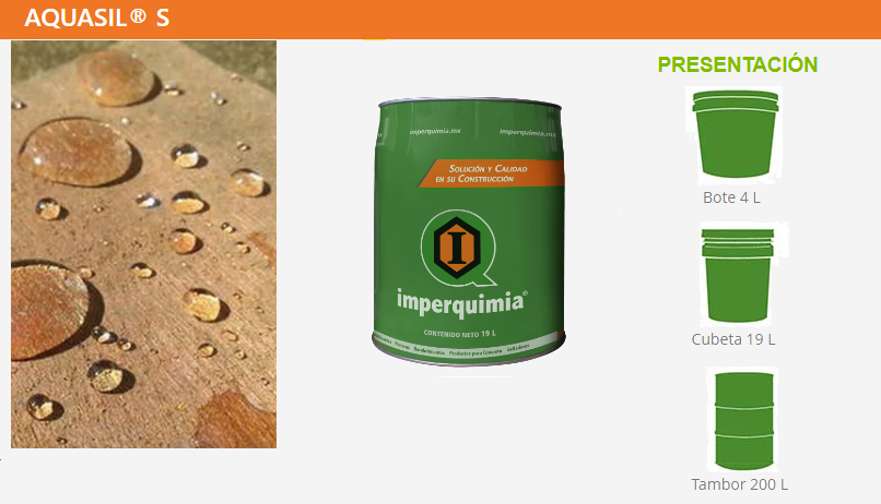 AQUASIL SⓇ es una solución hidrofugante, repelente, formulada a base de resina de silicona en solvente volátil de alto poder penetrante, contiene agente impregnante que modifica los poros de la superficie a tratar cubriendo con silicón y polímeros de alta resistencia.