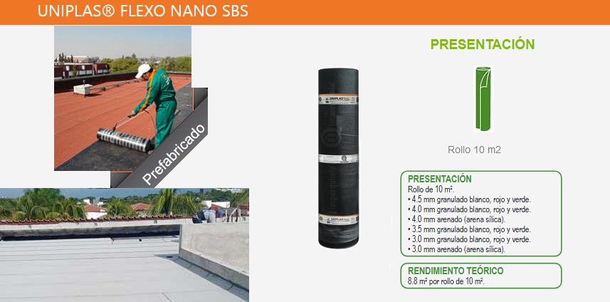 UNIPLASⓇ FLEXO NANO SBS es una lámina ecológica prefabricada especialmente diseñada para la impermeabilización de todo tipo de techos. Formulada a partir de asfaltos modificados nanotecnológicamente con polímeros sintéticos SBS (Estireno Butadieno Estireno), reforzada con malla de fibra de vidrio o malla de poliéster. El acabado de una de las caras es de polietileno y en la cara aparente gravilla esmaltada, cerámica o arenado.