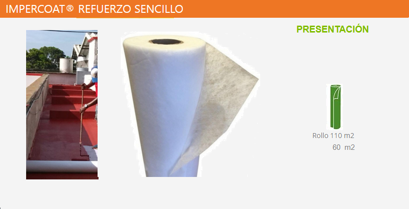 IMPERCOATⓇ REFUERZO SENCILLO es una membrana de refuerzo de color blanco, fabricada a base de fibras poliéster poli-orientadas no tejidas, que le confieren una gran flexibilidad y resistencia a los esfuerzos mecánicos.